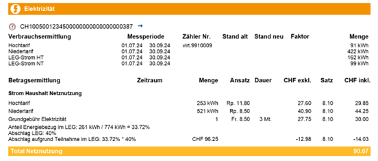 Hinweis: Auch für Zähler des Verteilnetzbetreibers in einem vZEV berechnet das System den Messtarif – er wird gemeinsam mit der virtuellen Hauptmessung verrechnet.